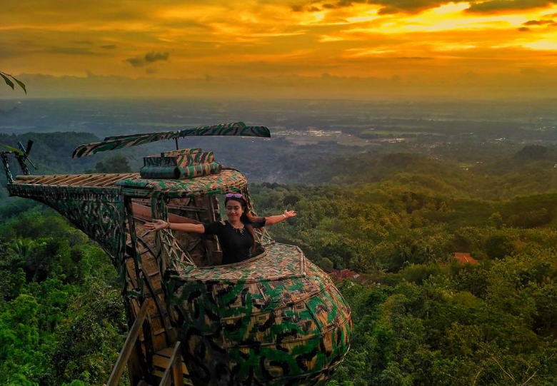 Berbeda dengan spot unik yang bervariasi di Bukit Mojo Gumelem, spot foto di Watu Goyang Mangunan berbentuk helikopter lucu denga warna hijau army ala militer.